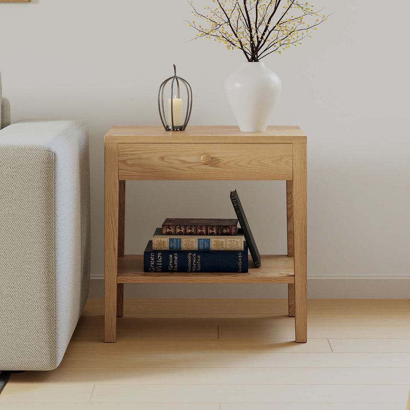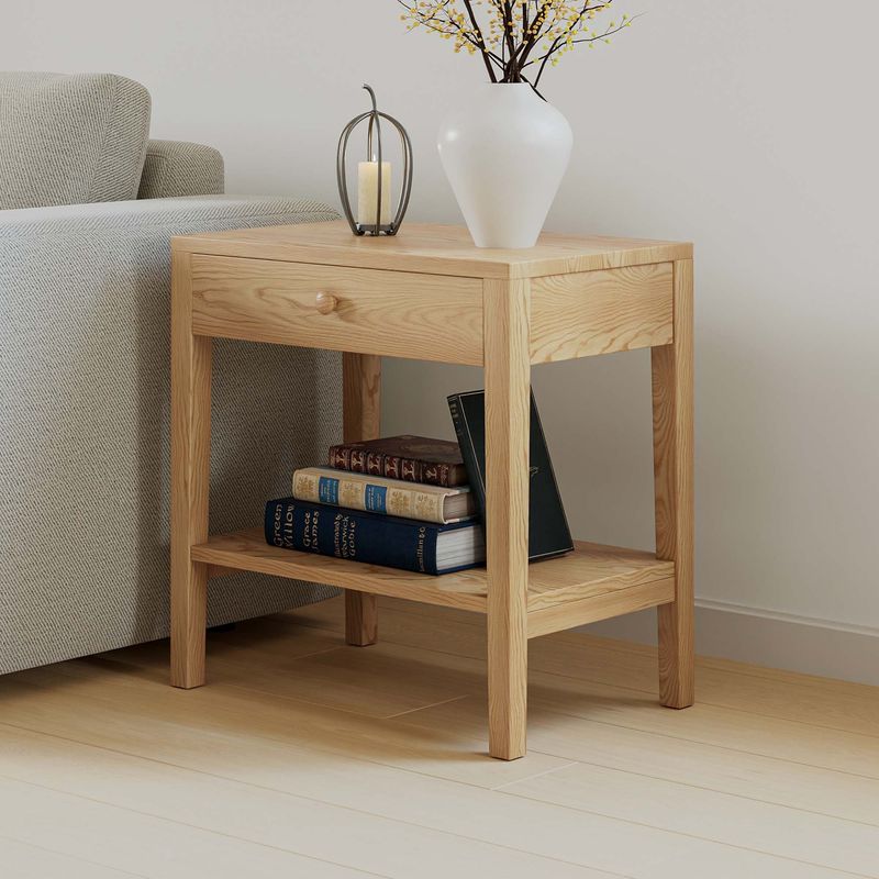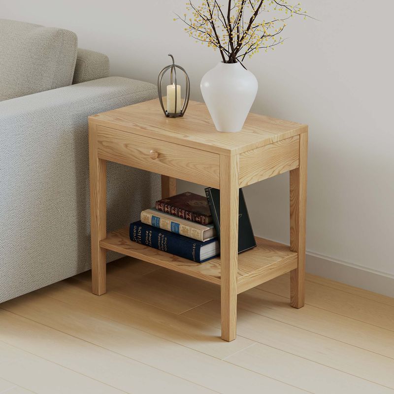 Imagine your quiet morning coffee, your book and blanket waiting neatly by the couch—this light-toned ashwood table slips right in, keeping things serene and within reach. Its soft-lined drawer and shelf hold little treasures out of sight but close to heart. Simplicity, served thoughtfully.