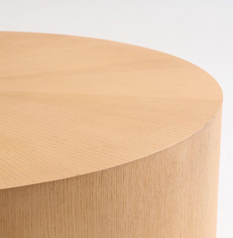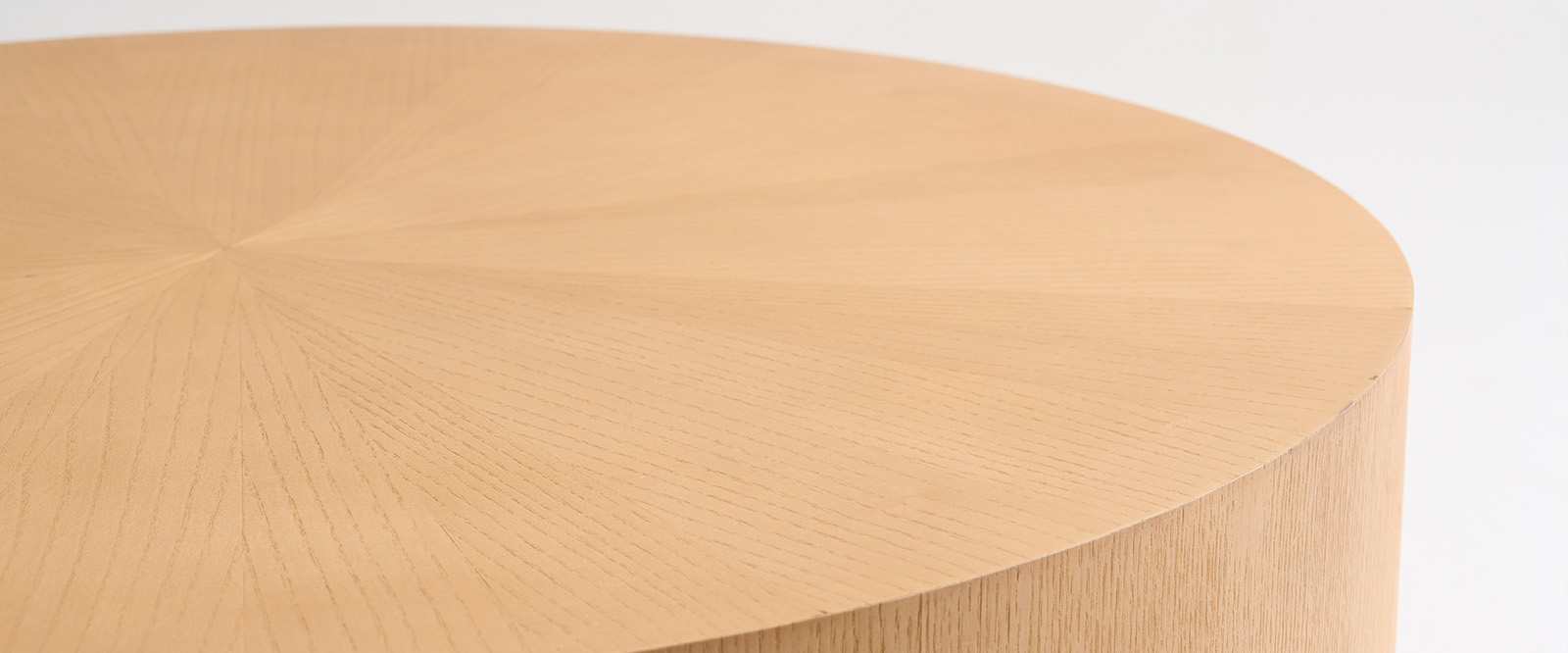 Clean cylindrical form with natural ash wood grain radiating gently from the center