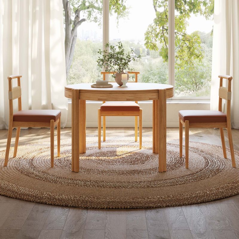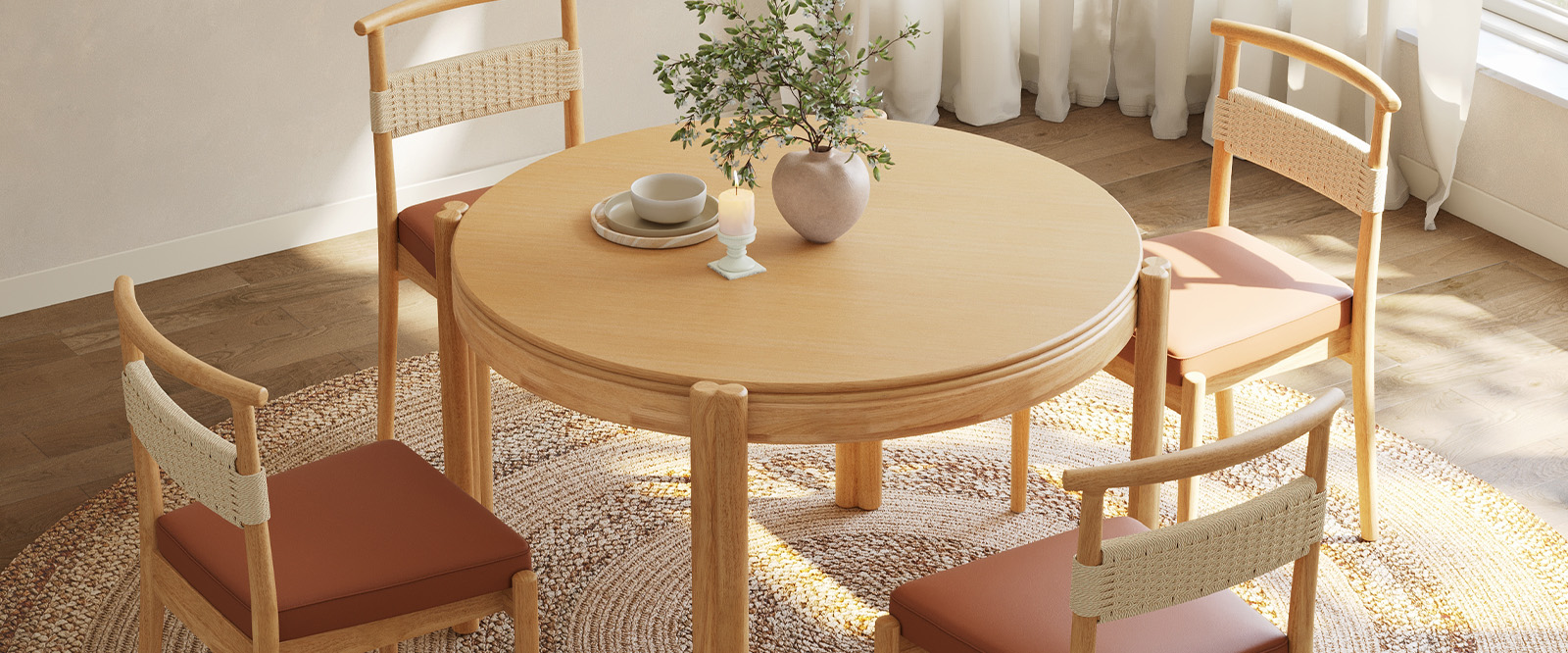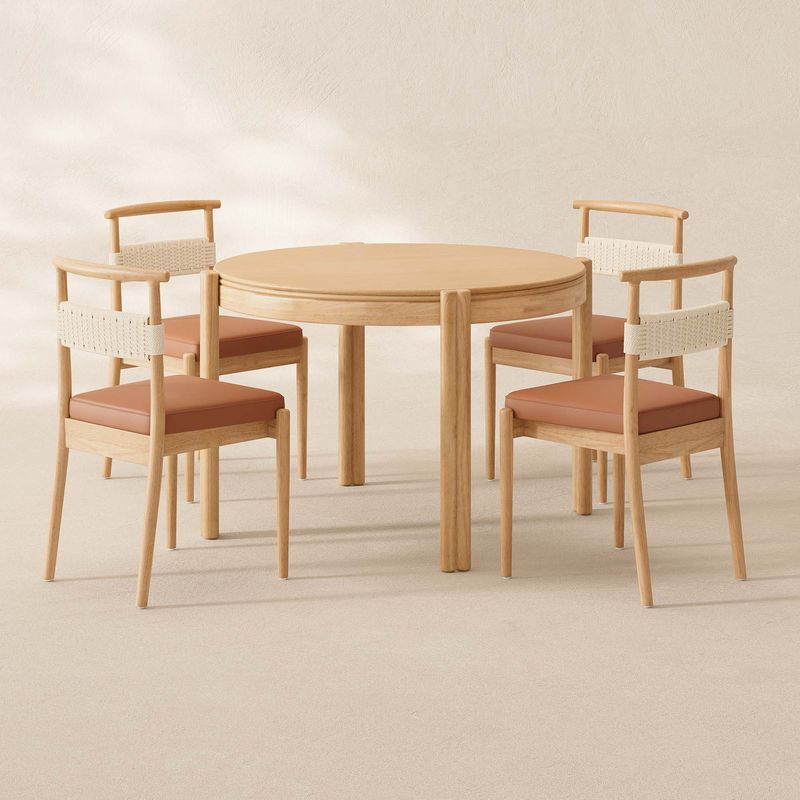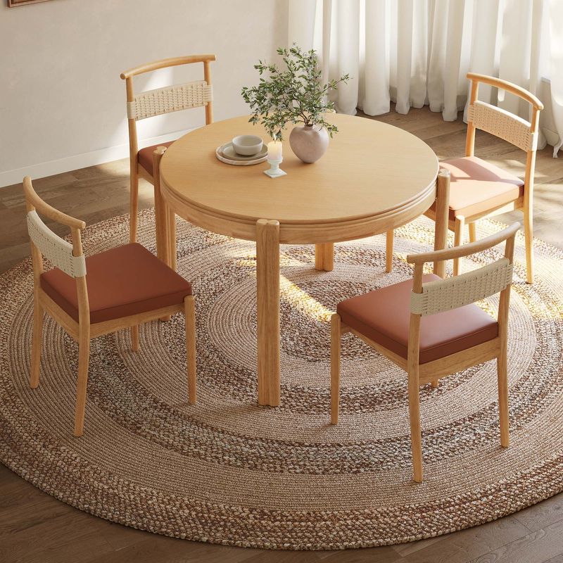 Gather around the Alvara Dining Set, where craftsmanship and comfort come together beautifully. The 49.4-inch solid rubberwood table with soft curved edges anchors the space, while four matching chairs with cushioned seats and handwoven paper cord backs add warmth and texture. Thoughtfully designed for long dinners, easy laughter, and everyday togetherness.