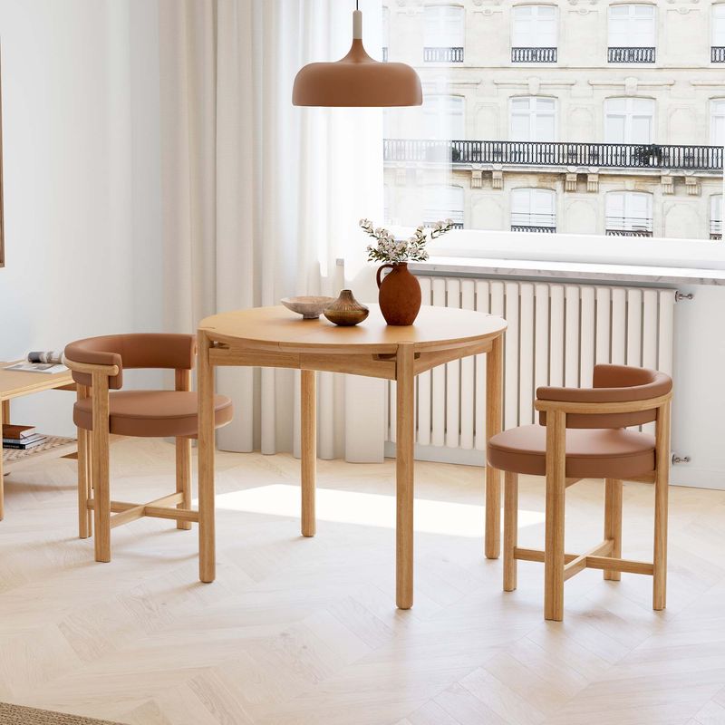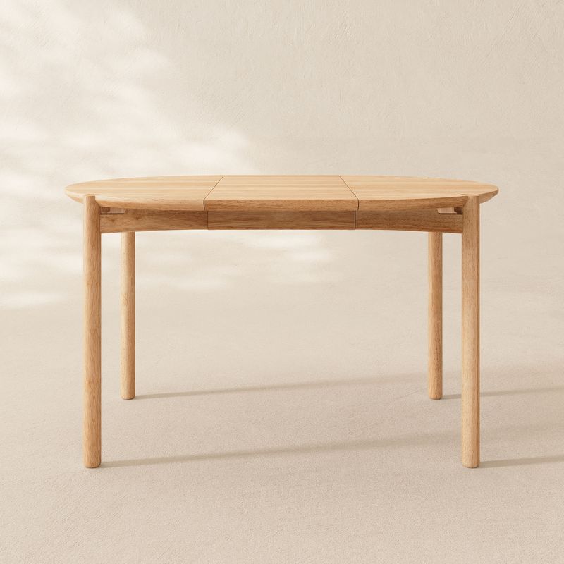 Crafted of rubber wood with rubber wood veneers.The rubber wood used in this product is sustainably sourced from trees that no longer produce latex.CPSIA-certified water-based finish, safe for family well-beingEvery piece of natural wood tells its own story, with unique color and texture, no two are alikeSpace-saving round top with smooth edges—safe and gentle for all family members.Easily extendable by one person, fitting 4–6 for meals, adapting to every gathering.Extension leaf stores under the table, no additional storage required, saving space.Some assembly required (approximately 20 minutes)