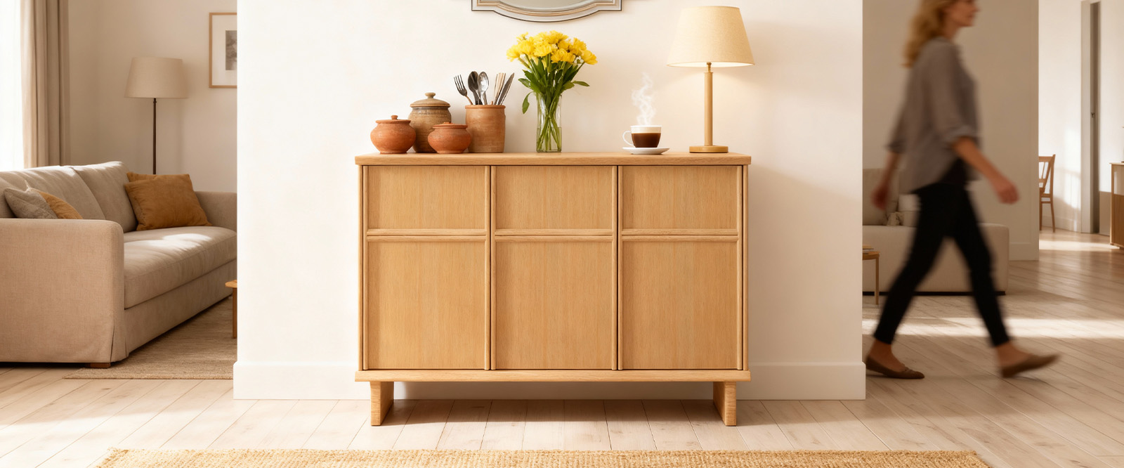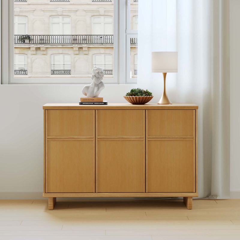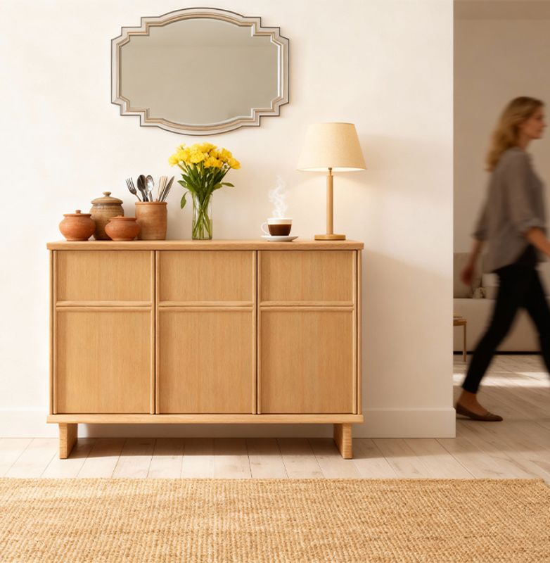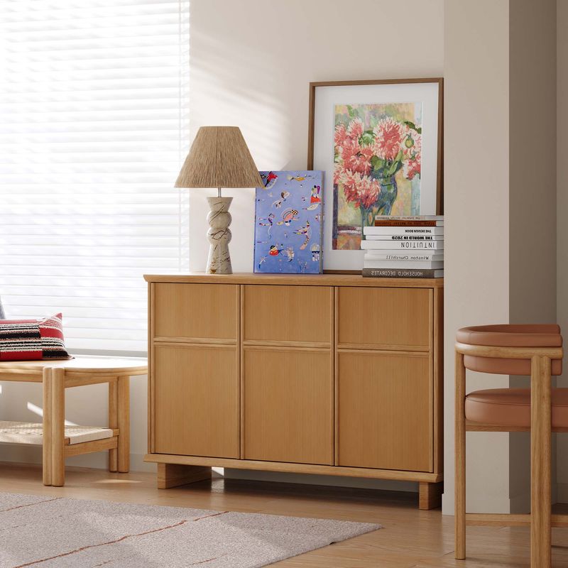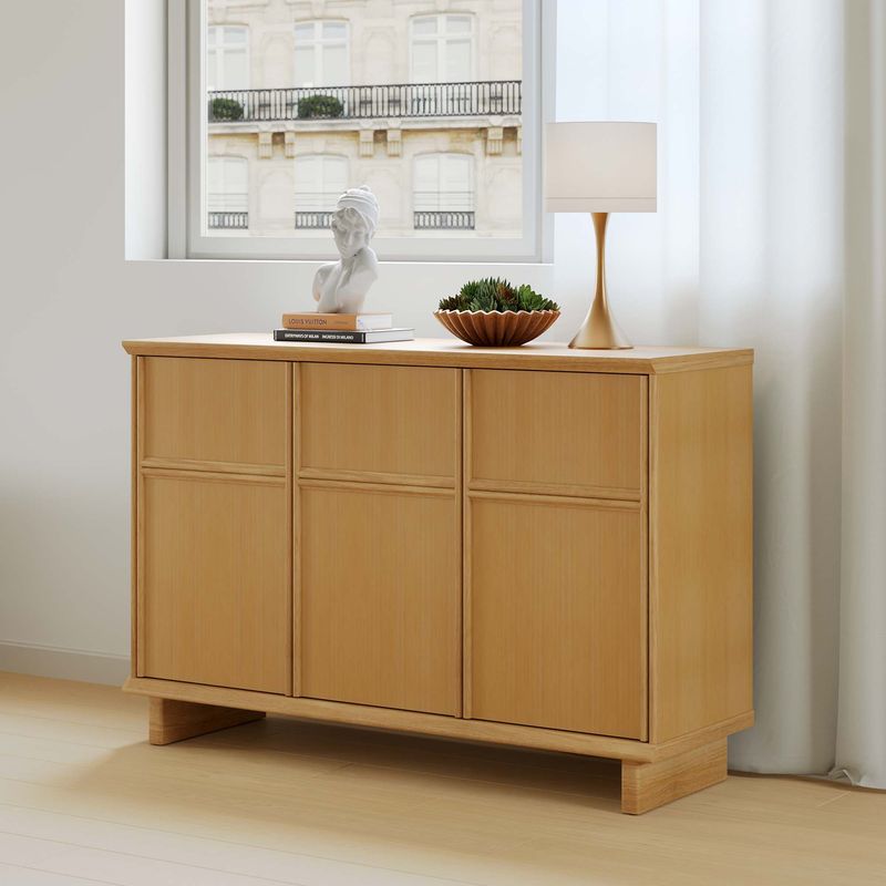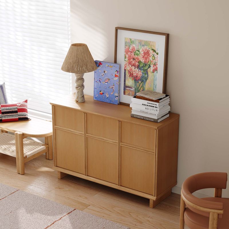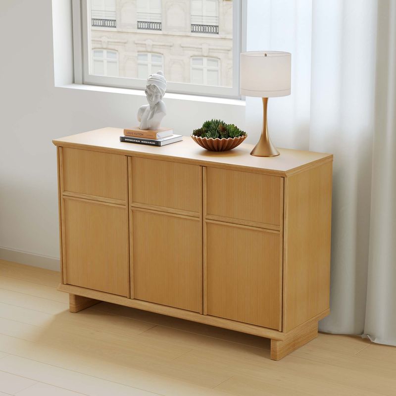 This sideboard from the Alvara collection brings a sense of calm and order into your home. Its clean, pastoral lines and gentle slope create a modern pastoral poem of quiet elegance, while three doors keep your belongings neatly stored and out of sight. The elevated base makes cleaning simple and lends a light, relaxed feel—helping you maintain a serene and tidy space with ease.