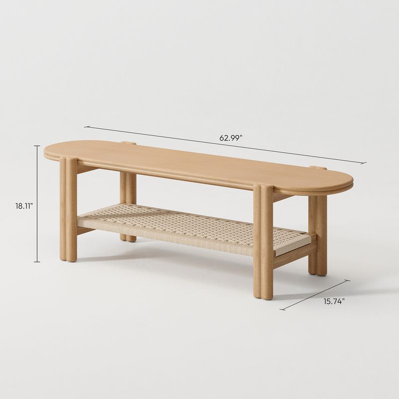 Meet Alvara—your home’s versatile companion. Crafted from solid rubberwood, this 63-inch oval bench serves beautifully as a dining seat, entryway bench, or coffee table. A woven hemp shelf below keeps your essentials close while bringing natural warmth to any space.