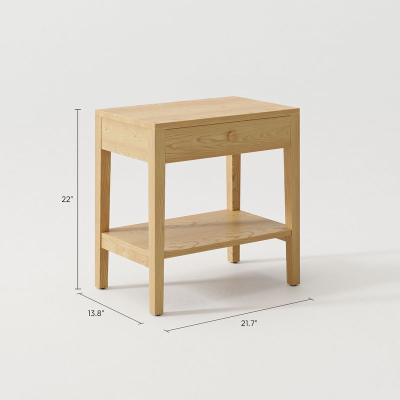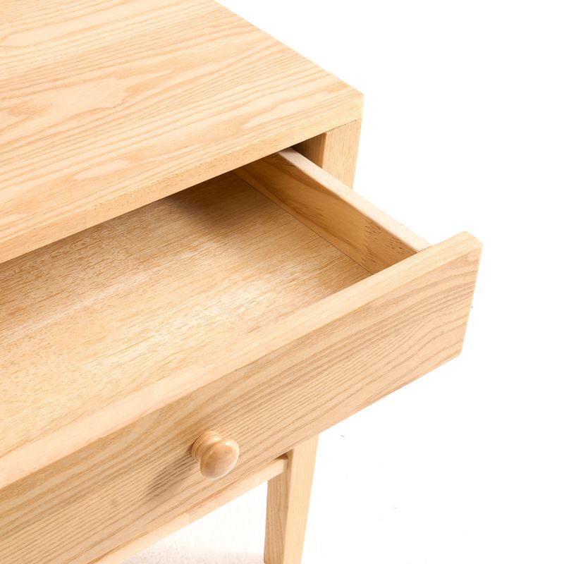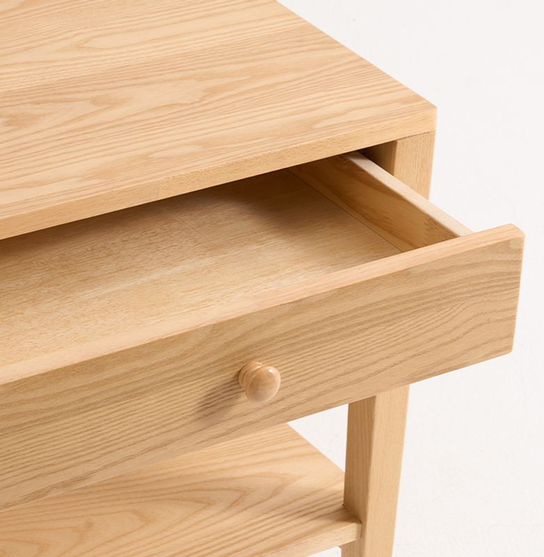 Imagine your quiet morning coffee, your book and blanket waiting neatly by the couch—this light-toned ashwood table slips right in, keeping things serene and within reach. Its soft-lined drawer and shelf hold little treasures out of sight but close to heart. Simplicity, served thoughtfully.