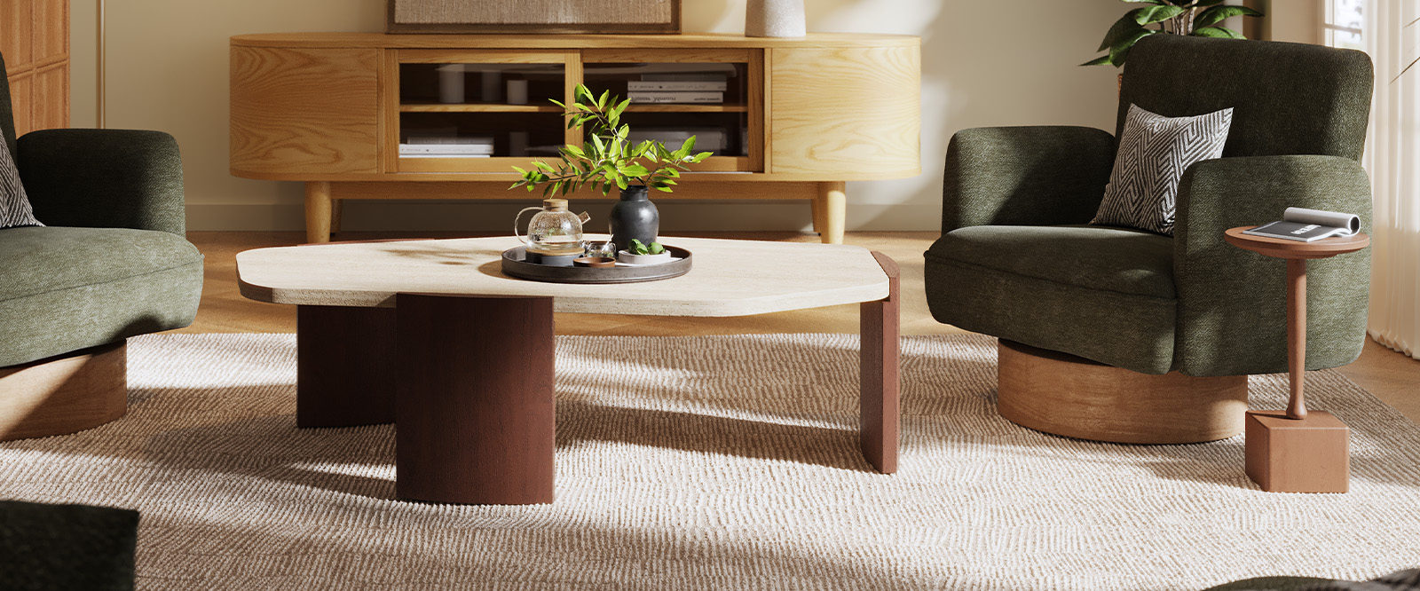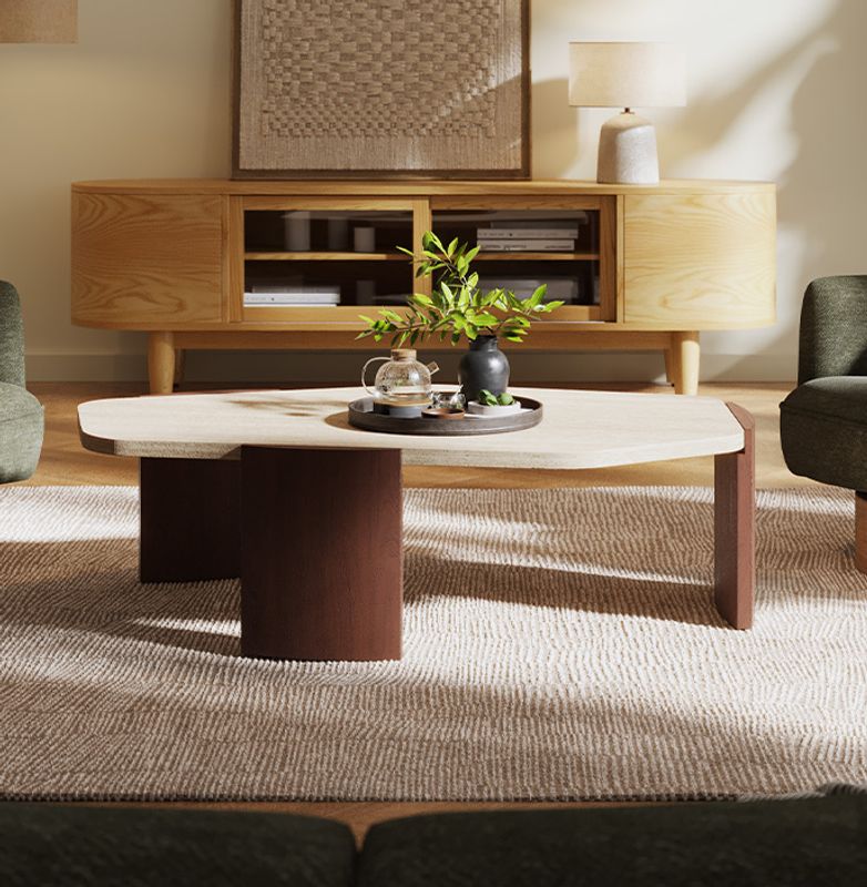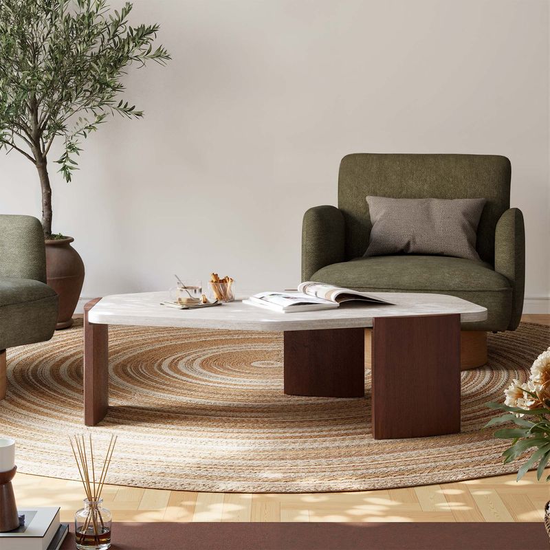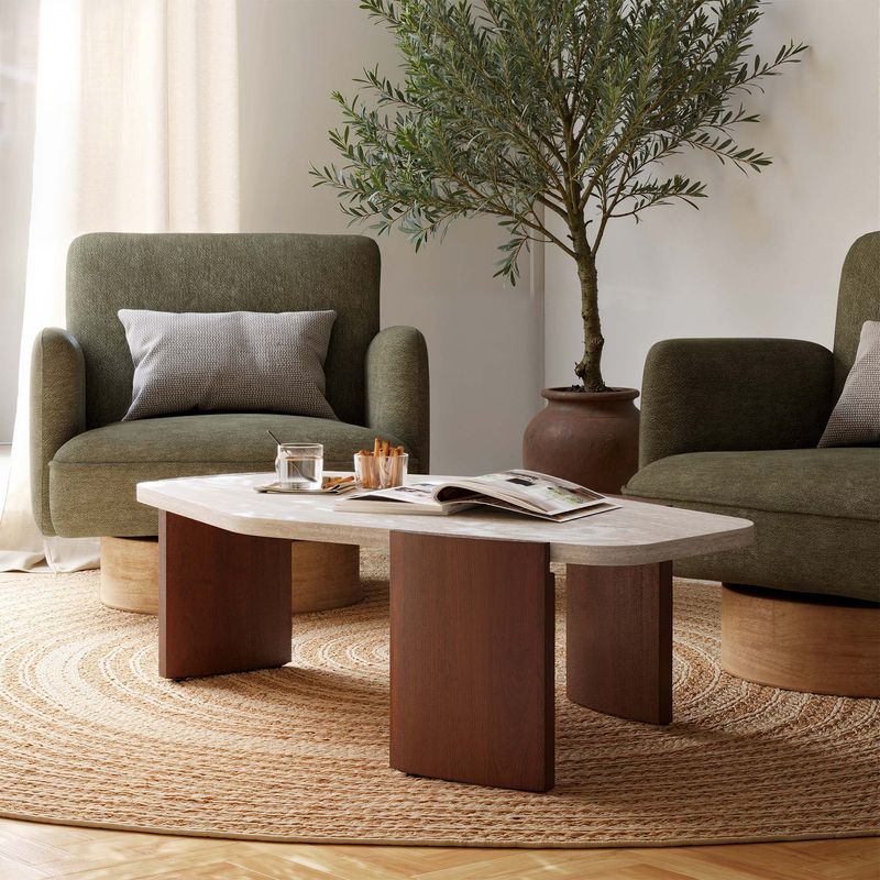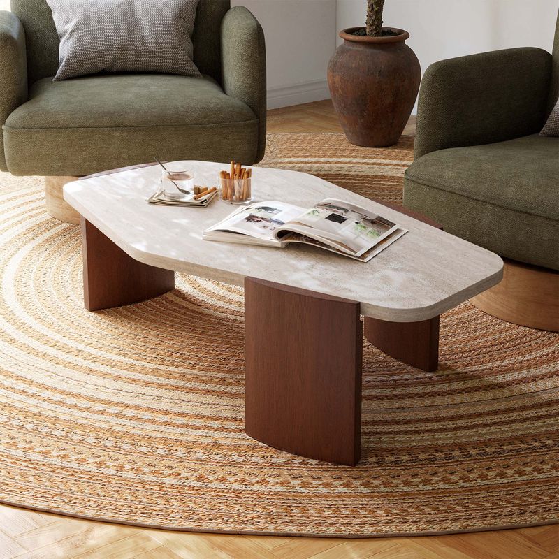 Crafted with a travertine-inspired tabletop and high-density fiberboard legs finished in ashwood veneerWe responsibly source our solid ashwood from sustainably managed forestsCPSIA-certified water-based finish & EPA P2 Certified, delivering a safer, eco-conscious home for your family and our planetSculpted with an organic, free-form silhouette and finished in a travertine style, the table is anchored by warm walnut legs for a commanding modern lookA gracefully unique surface for coffee, books, or quiet moments—light yet steadySome assembly required (approximately 15 minutes)