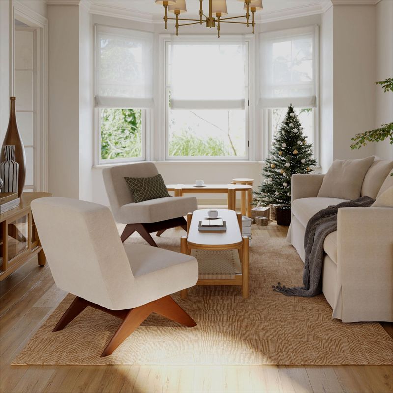 With a frame of solid rubberwood and a seat cushioned in breathable linenThe rubberwood used in this product is sustainably sourced from trees that no longer produce latexRest easy with TB117 certified flame resistance and a spill-resistant surface that wipes clean in seconds for lasting peace of mindAngled walnut legs with minimalist linen upholstery, merging sturdiness and airy eleganceA plush seat with 45D foam and airy linen upholstery that stays cool and comfortable for relaxed loungingSome assembly required (approximately 15 minutes)