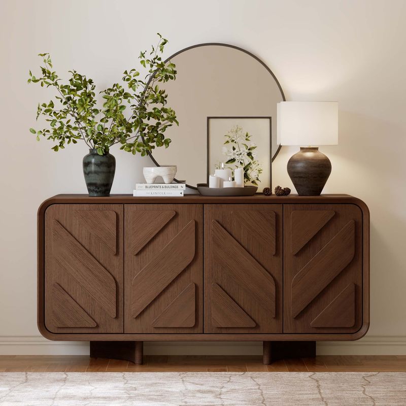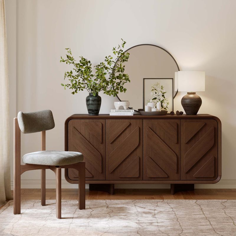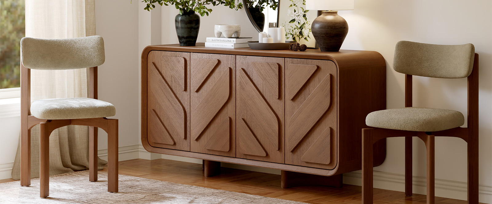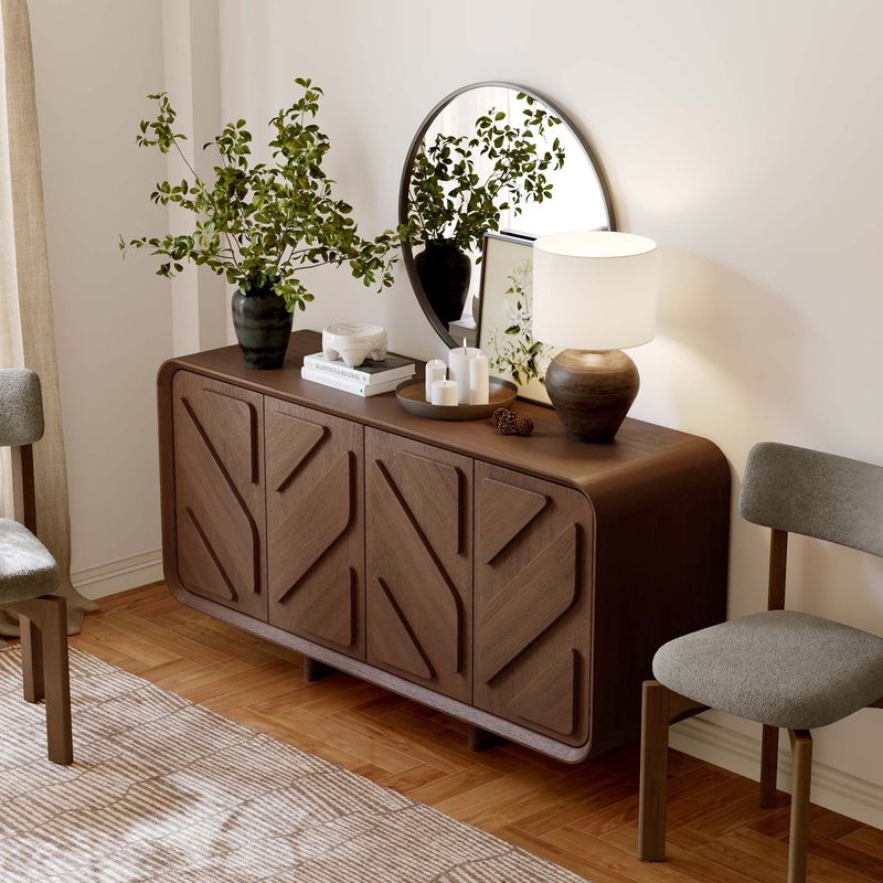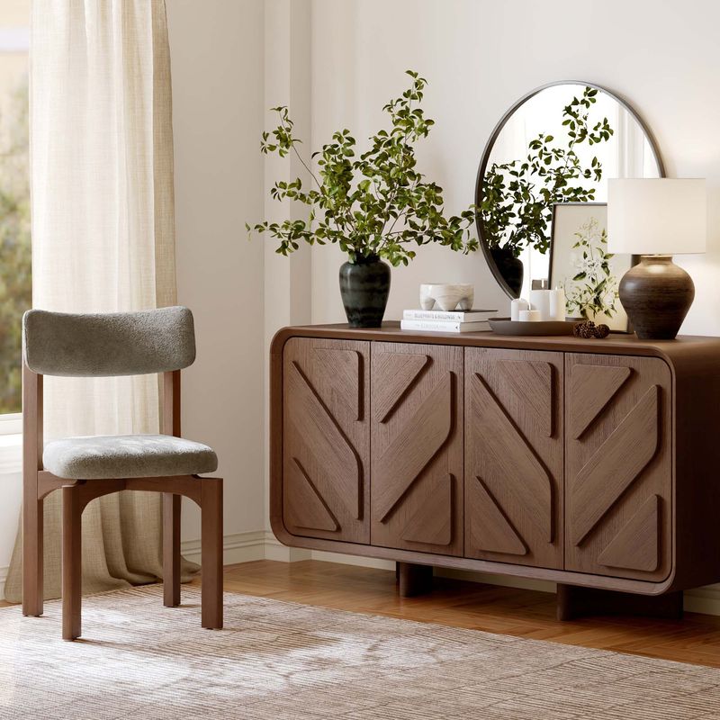 Crafted of rubber wood with rubber wood veneersThe rubber wood used in this product is sustainably sourced from trees that no longer produce latexCPSIA-certified water-based finish & EPA P2 Certified, delivering a safer, eco-conscious home for your family and our planetEvery piece of natural wood tells its own story, with unique color and texture, no two are alikeA warm, curved form with subtle botanical detailing, defining your space with quiet graceCustomizable storage space behind a gently closing door, bringing calm order to your daily lifeSome assembly required (approximately 30 minutes)