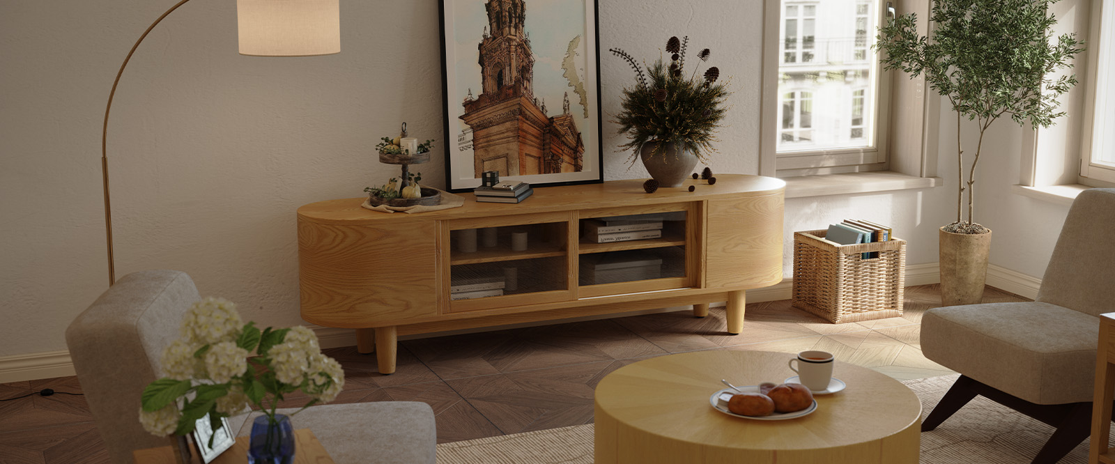 Where warm wood grain tells a unique story, and every curve is a gentle promise of safety. This is more than a console—it’s a quiet guardian for your living room. Tuck away cords effortlessly, glide the sturdy glass doors shut, and feel the calm that comes with a clutter-free space designed for real life, with little ones and grandparents in mind.