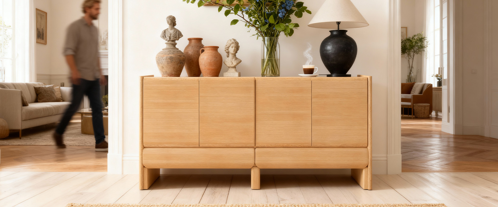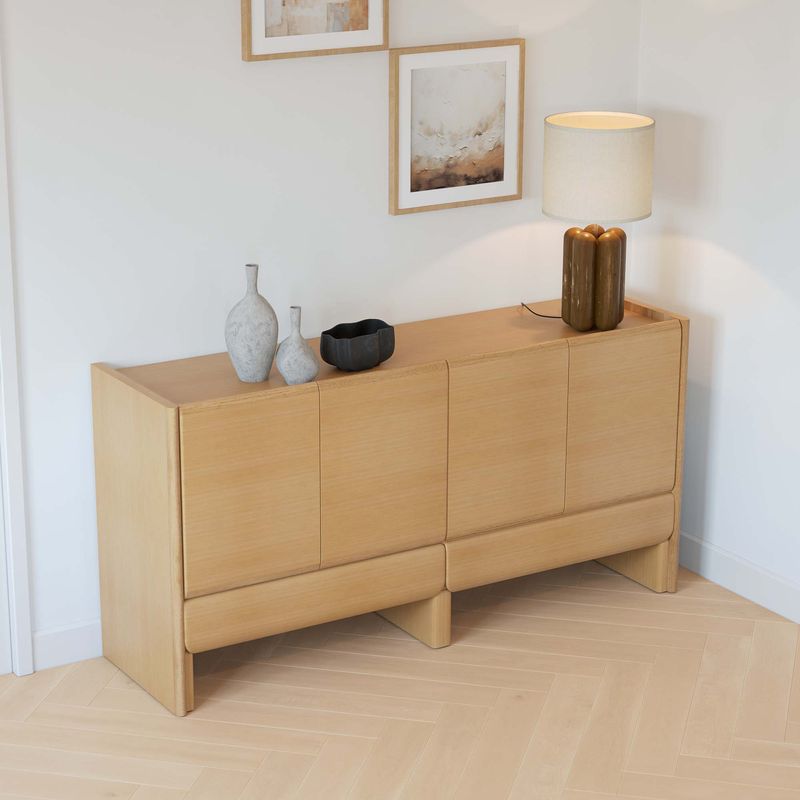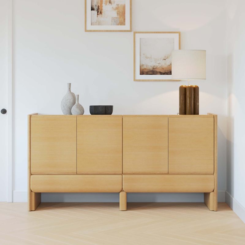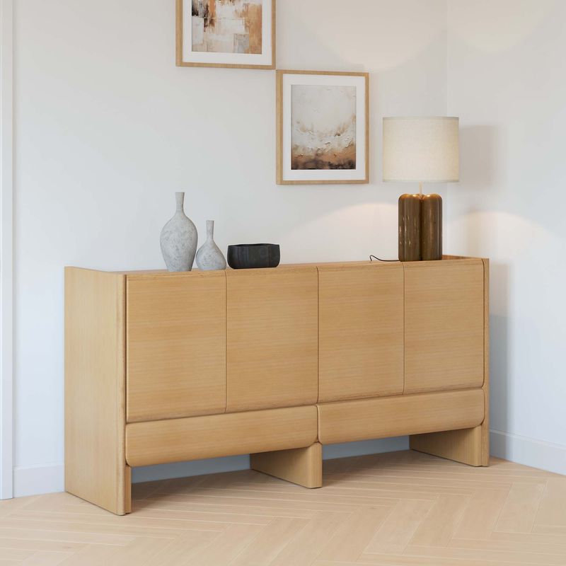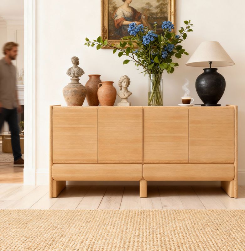 Find a round, quiet answer to the daily hustle. This sideboard blends seamlessly into your home with its gentle, corner-free curves, offering a safe and serene presence. Inside, adaptable shelves create a dedicated space for everything you love and use. It’s the elegant clarity your dining area needs, turning clutter into calm.