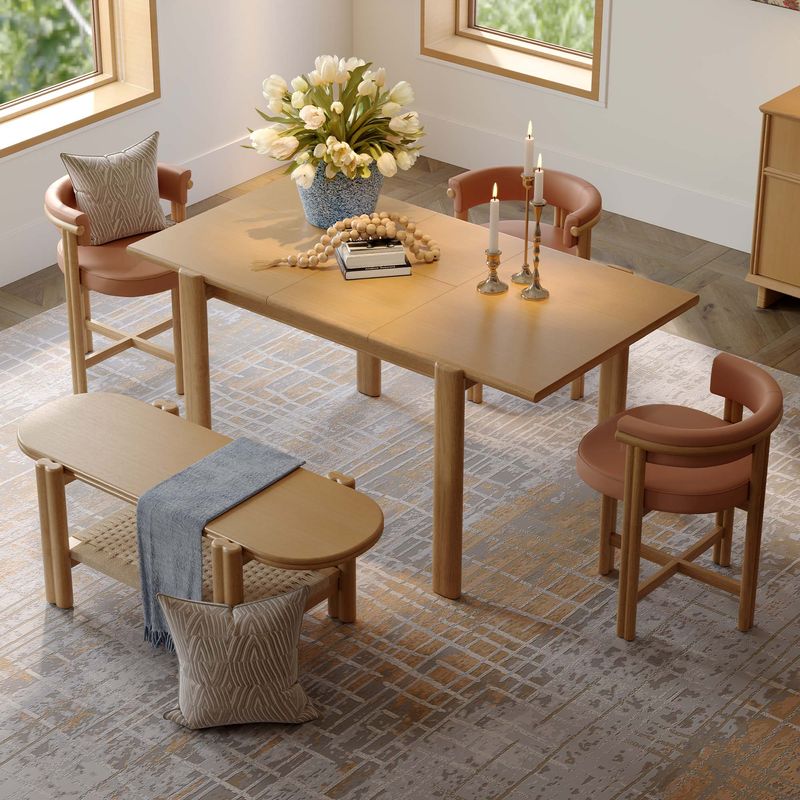 Crafted of rubber wood with rubber wood veneers.The rubber wood used in this product is sustainably sourced from trees that no longer produce latex.CPSIA-certified water-based finish, safe for family well-beingEvery piece of natural wood tells its own story, with unique color and texture, no two are alikeFour sturdy wooden legs provide stable, wobble-free support.Easily extendable by one person, fitting 4–6 for meals, adapting to every gathering.Some assembly required (approximately 20 minutes)
